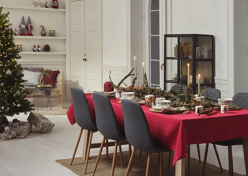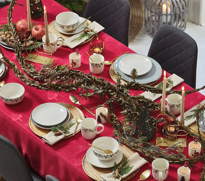 Masanı qurarkən qırmızı və təbiət elementlərindən istifadə edin. Bunu etmək çox asandır və heyrətamiz görünür. GULDSTEN kimi süfrədən istifadə edin, küçədə şam qozalarını, köhnə dekorativ budaqları və budaqları tapın və onları əsas kompozisiya kimi istifadə edin. HORNBLENDE boşqabları, kasaları, fincanları və dəbli SKINFAXE, HARMOND və ya ERVIN şamdanlarını əlavə edin.